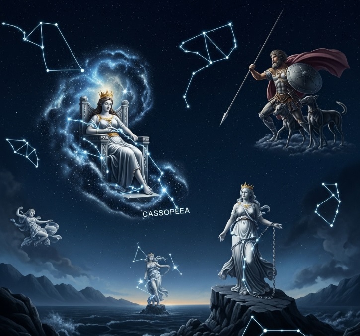 - 카시오페이아: 권력·미모의 오만 → 공동체 재앙 → 끝없는 속죄(거꾸로 매달린 형상).