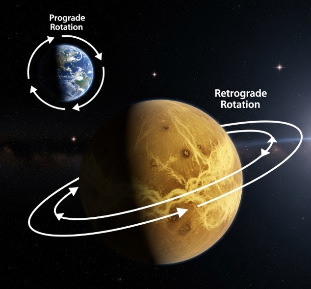 반면, 금성과 천왕성은 ‘역행 자전(retrograde rotation)’을 합니다. 금성은 북극에서 내려다보면 시계 방향으로 회전합니다.