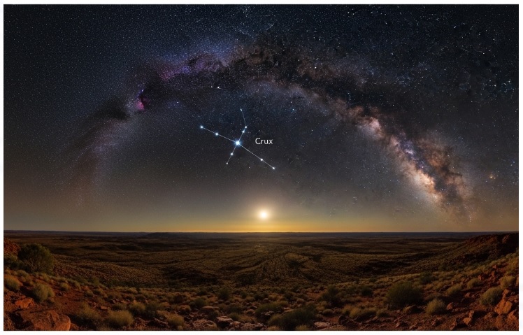 남십자성(크룩스)은 남반구를 대표하는 별자리로, 호주, 뉴질랜드, 남아프리카, 남아메리카 등지에서 매우 쉽게 볼 수 있습니다. 남십자성은 이름처럼 네 개의 밝은 별이 십자가 모양으로 배열되어 있습니다. 밤하늘에서 찾기 쉬우며, 남쪽 방향을 알려주는 ‘천연 나침반’ 역할을 합니다. 호주 국기, 뉴질랜드 국기에도 남십자성이 그려져 있을 만큼 그 상징성은 남다릅니다.