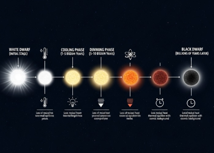 백색왜성은 자체적으로 에너지를 만들어내지 못하기 때문에, 주변 우주에 계속해서 남아 있는 에너지를 방출하며 점점 식고 어두워집니다. 이 과정은 인간의 시간 감각과 비교할 수 없을 만큼 느리게 일어납니다. 계산에 따르면, 현재 우주(약 138억 년)의 나이로도 백색왜성이 완전히 식어 ‘검은왜성’이 된 사례는 단 하나도 존재하지 않습니다. 모든 백색왜성은 아직도 뜨겁고, 천천히 빛을 잃어가고 있을 뿐입니다.