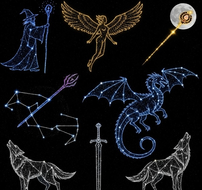 판타지 소설이나 SF(공상과학) 소설 속의 세계관에는, 실제로 존재하지 않는 ‘마법의 별자리’, ‘운명의 별자리’, ‘전설의 별자리’가 종종 등장합니다. 이 별자리들은 작품의 신화나 운명, 예언, 마법과 밀접하게 연결되어 인물의 성격, 미래, 세계관 설정을 강화합니다.