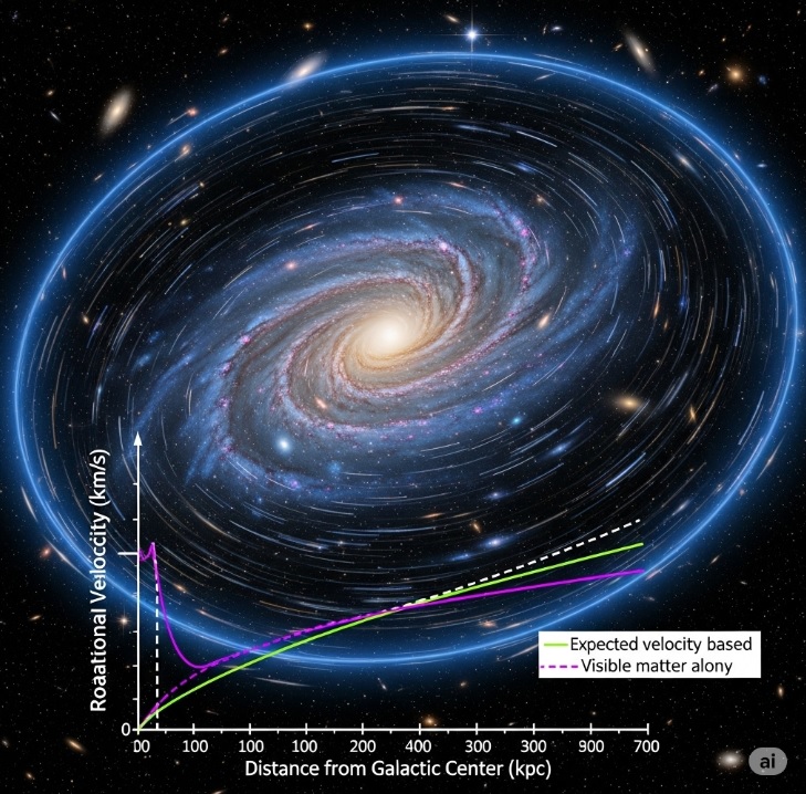 이 미스터리를 설명하는 가장 유력한 해석이 바로, 우리 눈에 보이지 않는 거대한 암흑물질 헤일로(halo)가 은하 전체를 감싸고 있기 때문이라는 것입니다. 오늘날 모든 거대 은하의 회전 곡선을 관측하면, 이런 암흑물질의 중력이 반드시 필요하다는 사실이 반복해서 확인되고 있습니다.