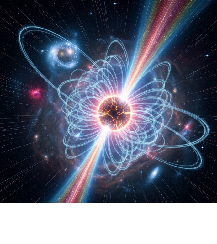 마그네타는 태양 질량의 8~20배 정도 되는 별이 수명을 다한 뒤 남는 초고밀도 중성자별의 일종입니다. 이 천체의 표면 자기장은 최대 1015 가우스에 달하며, 이는 지구 자기장의 1조 배, 태양 흑점의 자기장의 수천만 배에 이르는 극단적인 수치입니다. 마그네타 내부의 강력한 자기장은 별의 구조와 표면에 엄청난 응력을 가합니다. 시간이 지나며 자기장이 재편성(reconfiguration)될 때마다, 표면에 균열이 생기고, 내부 에너지가 폭발적으로 방출됩니다. 이 에너지는 주로 X선, 감마선 플레어 형태로 방출되어 우주 공간을 가로지릅니다.