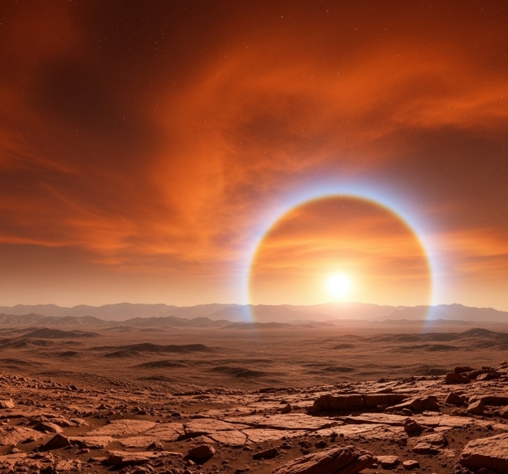이 과정에서 먼지는 붉은빛과 오렌지빛을 더 넓게 산란시켜 먼 곳까지 확산시킵니다. 반면 파란빛은 먼지에 의해 오히려 태양 바로 주변으로 모이게 됩니다. 그 결과 해가 질 때 태양 주위로 신비롭게 파란빛 오라가 나타나며, 지구의 붉은 노을과 정반대의 장면이 펼쳐집니다.